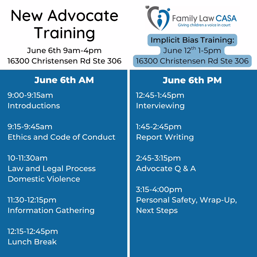 Family Law CASA’s volunteer training happens 3-4 times per year, typically on a Friday from 9am-4pm, in person at our office. This session provides essential skills in advocacy and family law to prepare volunteers for meaningful service. No virtual option available.